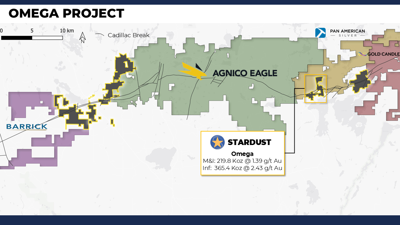 Located along the prolific Kirkland Lake / Cadillac–Larder Lake Break, Omega hosts a shallow, high-grade gold resource last defined in 2013 at a conservative ~US$1,200/oz gold price. The project has a strong production history, with 217,500 ounces mined at 5.4 g/t gold, and benefits from excellent infrastructure including highway access, grid power, and an existing tailings facility. With more than 30,000 metres of historical drilling in the database, Omega is a well-advanced gold asset strategically situated beside Agnico Eagle’s Upper Beaver, Pan American Silver’s Larder, and the historic Kerr Addison deposit.