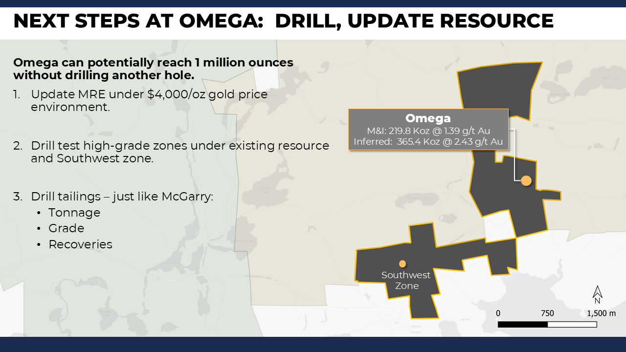 Omega is well-positioned for its next phase of growth. With the potential to approach 1 million ounces without drilling another hole, the Company plans to update the Mineral Resource Estimate under a more conservative US$4,000/oz gold price environment, unlocking immediate ounces through model refinement. Targeted drilling will focus on high-grade zones beneath the existing resource and the Southwest Zone, where historical intersections suggest strong grade continuity at depth. The Company also intends to drill-test the Omega tailings, following the same successful approach used at McGarry, to assess tonnage, grade, and metallurgical recoveries as a potential near-surface, low-cost resource addition. Omega currently hosts 219.8 koz at 1.39 g/t Au (M&I) and 365.4 koz at 2.43 g/t Au (Inferred), providing a strong foundation for meaningful resource expansion.